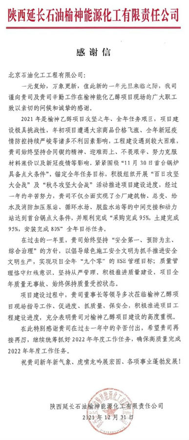 元旦前夕,北京石油化工工程有限公司先后收到延長石油集團和旗下的榆神能化公司發來的感謝信,信中對北油工程EPC總承包的50萬噸/年煤基乙醇項目建設期間付出的辛勤勞動表示感謝,并向項目現場廣大職工致以節日的問候。