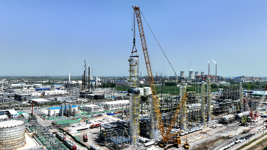 乙醇精制塔上塔的順利封頂,吹響了大件吊裝沖鋒的號角,向4月底大件吊裝全面收官的目標邁出堅實的一步。(通訊員/黃耀輝 攝/王超)
